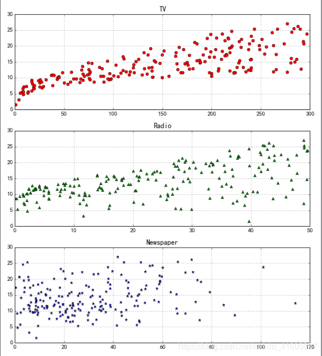 #导入相关的包import numpy as npimport matplotlib as mplimport matplotlib.pyplot as pltimport pandas as pdfrom sklearn.model_selection import train_test_splitfrom sklearn.linear_model import LinearRegressionif __name__ == "__main__": path = 'Advertising.csv'#文件的路径 # pandas读入 data = pd.read_csv(path) # TV、Radio、Newspaper、Sales x = data[['TV', 'Radio', 'Newspaper']] #x = data[['TV', 'Radio']] y = data['Sales'] mpl.rcParams['font.sans-serif'] = [u'simHei'] mpl.rcParams['axes.unicode_minus'] = False # 绘制1 plt.figure(facecolor='w') plt.plot(data['TV'], y, 'ro', label='TV') plt.plot(data['Radio'], y, 'g^', label='Radio') plt.plot(data['Newspaper'], y, 'mv', label='Newspaer') plt.legend(loc='lower right') plt.xlabel(u'广告花费', fontsize=16) plt.ylabel(u'销售额', fontsize=16) plt.title(u'广告花费与销售额对比数据', fontsize=20) plt.grid() plt.show() # 绘制2右下角的那个小的图框 plt.figure(facecolor='w', figsize=(9, 10)) plt.subplot(311) plt.plot(data['TV'], y, 'ro') plt.title('TV') plt.grid() plt.subplot(312) plt.plot(data['Radio'], y, 'g^') plt.title('Radio') plt.grid() plt.subplot(313) plt.plot(data['Newspaper'], y, 'b*') plt.title('Newspaper') plt.grid() plt.tight_layout() plt.show() x_train, x_test, y_train, y_test = train_test_split(x, y, train_size=0.8, random_state=1)#这里使用了函数的交叉验证集的问题80%的测试20%的验证集 print(type(x_test)) print("x_train.shape=",x_train.shape,"y_train.shape=", y_train.shape) linreg = LinearRegression()# 使用线性回归模型 #linreg = Lasso() """#另一种数据降维方法,该方法不仅适用于线性情况,也适用于非线性情况。Lasso是 基于惩罚方法对样本数据进行变量选择,通过对原本的系数进行压缩,将原本很小的系数直接压缩至0,从而将这部分系数所对应的变量视为非显著性变量,将不显著的变量直接舍弃。""" #linreg = Ridge()#使用的是岭回归模型 model = linreg.fit(x_train, y_train) print("model=",model) print("linreg.coef_",linreg.coef_,"linreg.intercept_",linreg.intercept_)#输出了系数矩阵 order = y_test.argsort(axis=0)#argsort()函数是将x中的元素从小到大排列 y_test = y_test.values[order] x_test = x_test.values[order, :] y_hat = linreg.predict(x_test) mse = np.average((y_hat - np.array(y_test)) ** 2) # Mean Squared Error rmse = np.sqrt(mse) # Root Mean Squared Error print('MSE = ', mse, ) print('RMSE = ', rmse) print('R2 = ', linreg.score(x_train, y_train)) print('R2 = ', linreg.score(x_test, y_test)) plt.figure(facecolor='w') t = np.arange(len(x_test)) plt.plot(t, y_test, 'r-', linewidth=2, label=u'真实数据') plt.plot(t, y_hat, 'g-', linewidth=2, label=u'预测数据') plt.legend(loc='upper right') plt.title(u'线性回归预测销量', fontsize=18) plt.grid(b=True) plt.show()